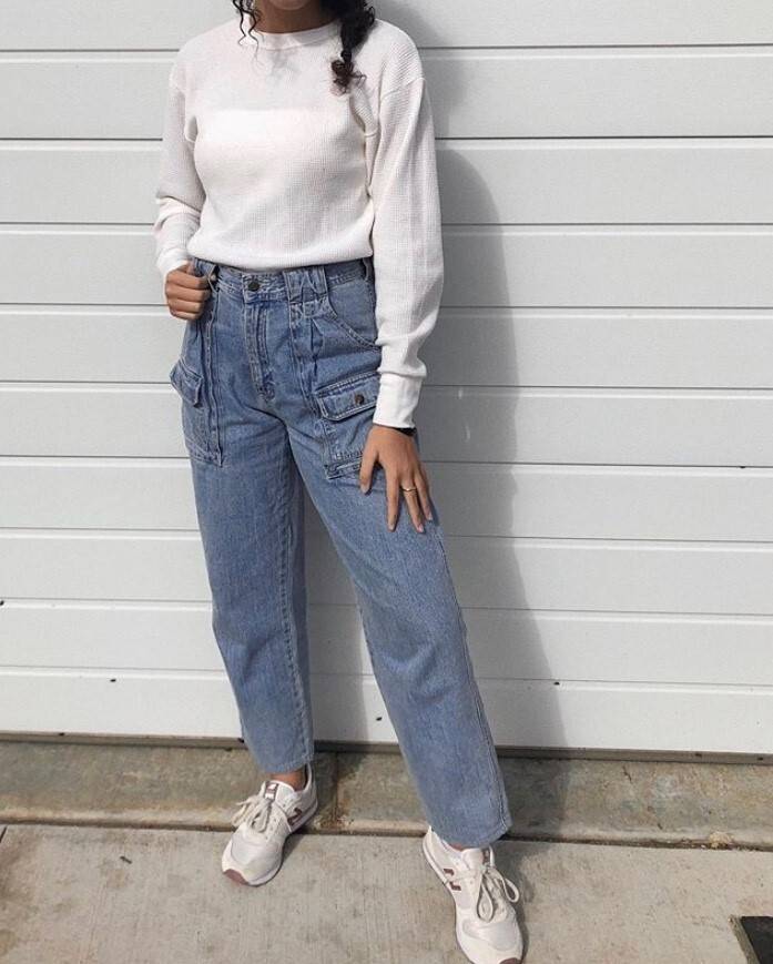 Marie wearing some of her favorite thrifted denim jeans from her local Goodwill.