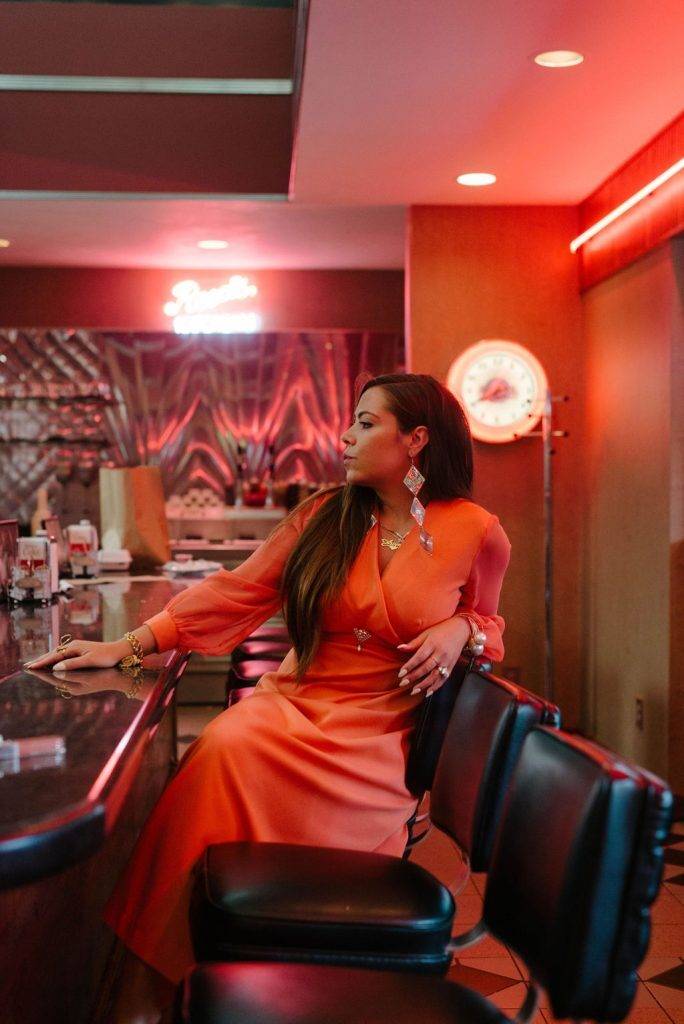 A: This orange dress, you just don’t find things like this much anymore, and it was on a rack at a Goodwill! But, I also love this yellow blazer for a more casual look (clearly from Goodwill as you can see I’m in the dressing room here).