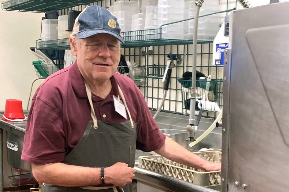 woman in goodwill t shirt smiles, working with man in apron as they wash bins